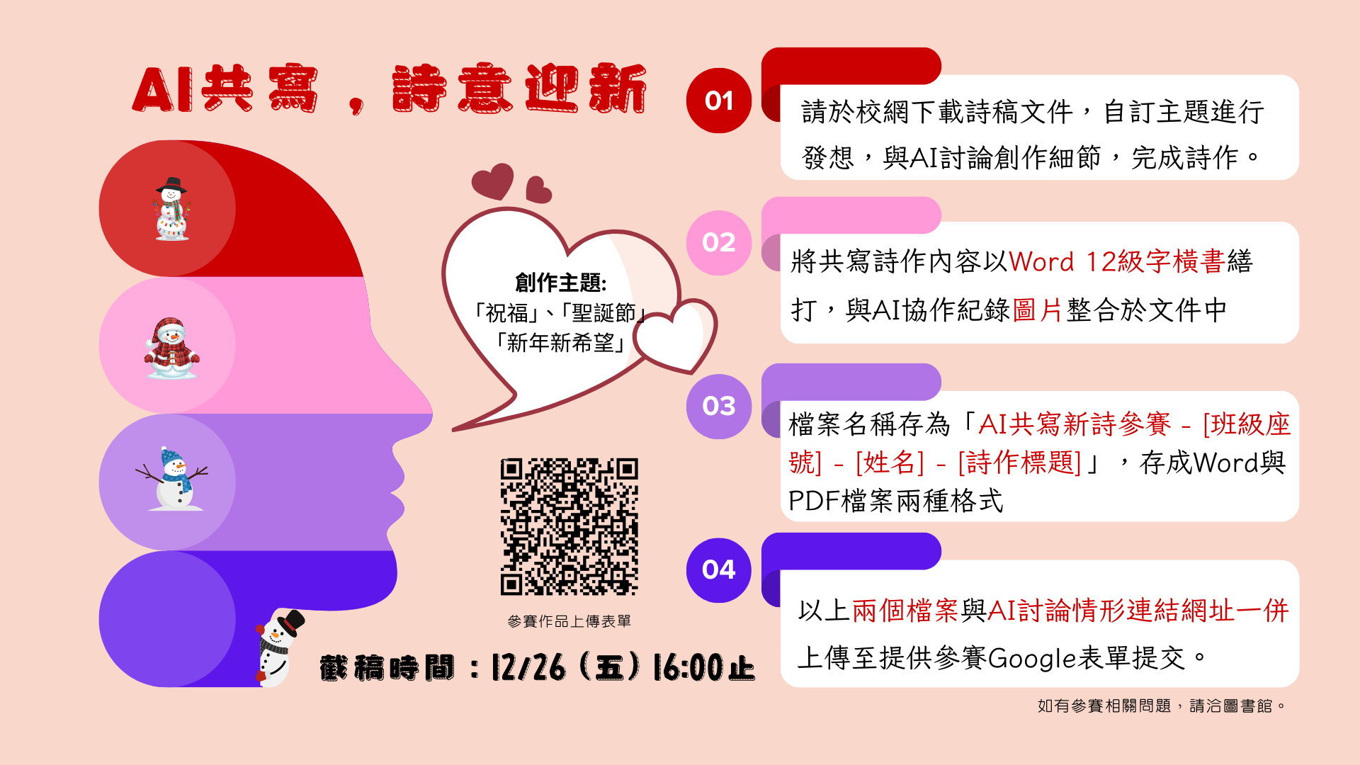 為推動校園閱讀與寫作風氣,鼓勵學生主動探索、運用現今人工智慧(AI)工具於文學創作領域,辦理本活動。期許學生透過與AI的深度對話與協作,在詩歌的韻律與意境中,展現獨特的創意、人文關懷,以及運用科技輔助適切表達的能力。