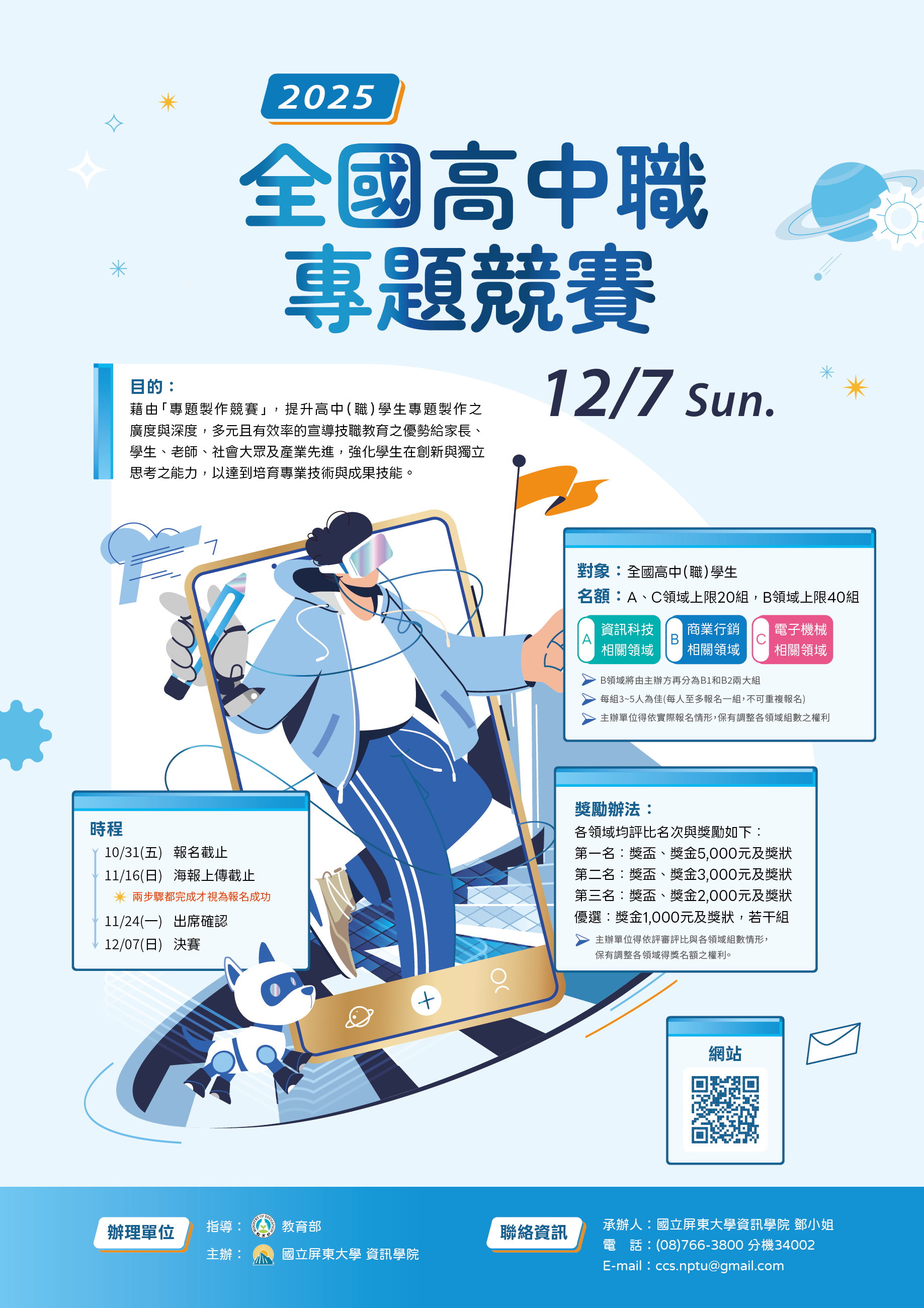屏東大學資訊學院舉辦「2025全國高中職專題競賽」二、相關資訊如下: (一)參賽對象:全國高中(職)學生。 (二)活動日期:114年12月7日(星期日)。 (三)活動地點:本校屏商校區風雨球場(屏東市民生東路51號)。 (四)報名流程: 1、填寫報名表:即日起至114年10月31日(星期五)止。 2、上傳競賽海報:114年11月16日(星期日)截止。 3、完成以上兩步驟才可進行決賽,未在期限內上傳海報之小組即失去競賽資格。 (五)活動網站:https://ccsnptu.wixsite.com/contest。 三、詳細活動內容,請參閱活動簡章(附件1)、海報(附件2)及常見問題(附件3)。 四、如有其他問題請洽活動電子信箱ccs.nptu@gmail.com。