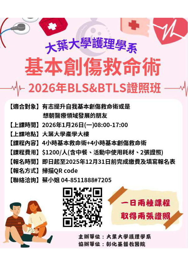 「2026大葉大學護理學系BLS & BTLS證照 班」活動資訊
