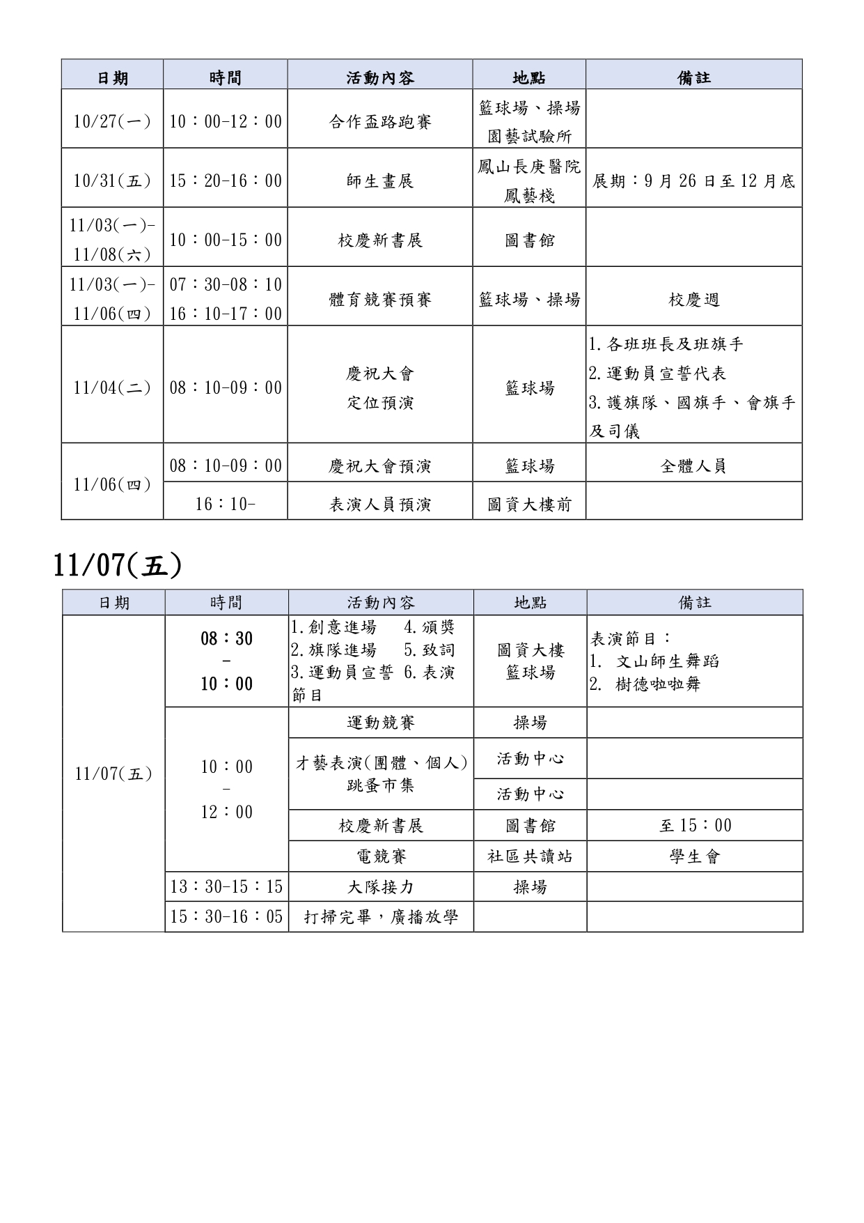 高雄市立文山高中56週年校慶暨運動大會流程表