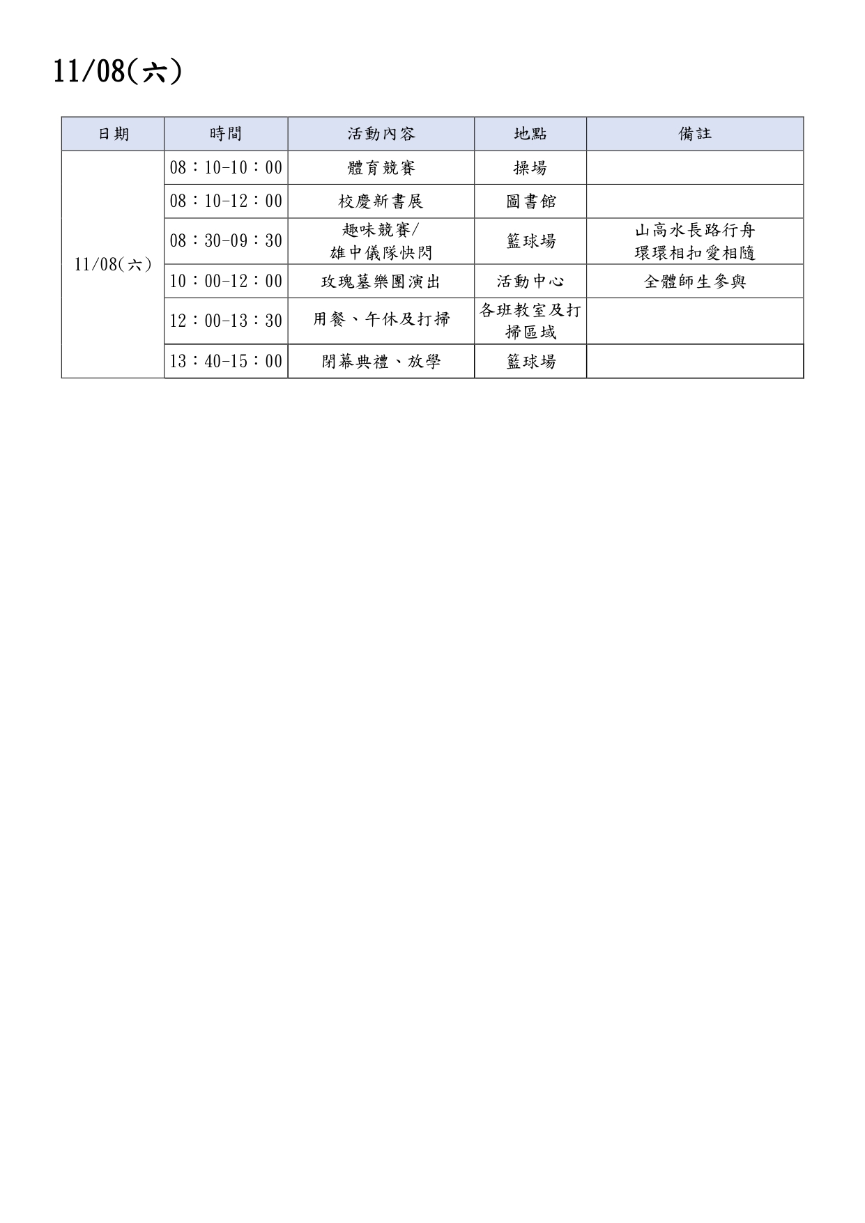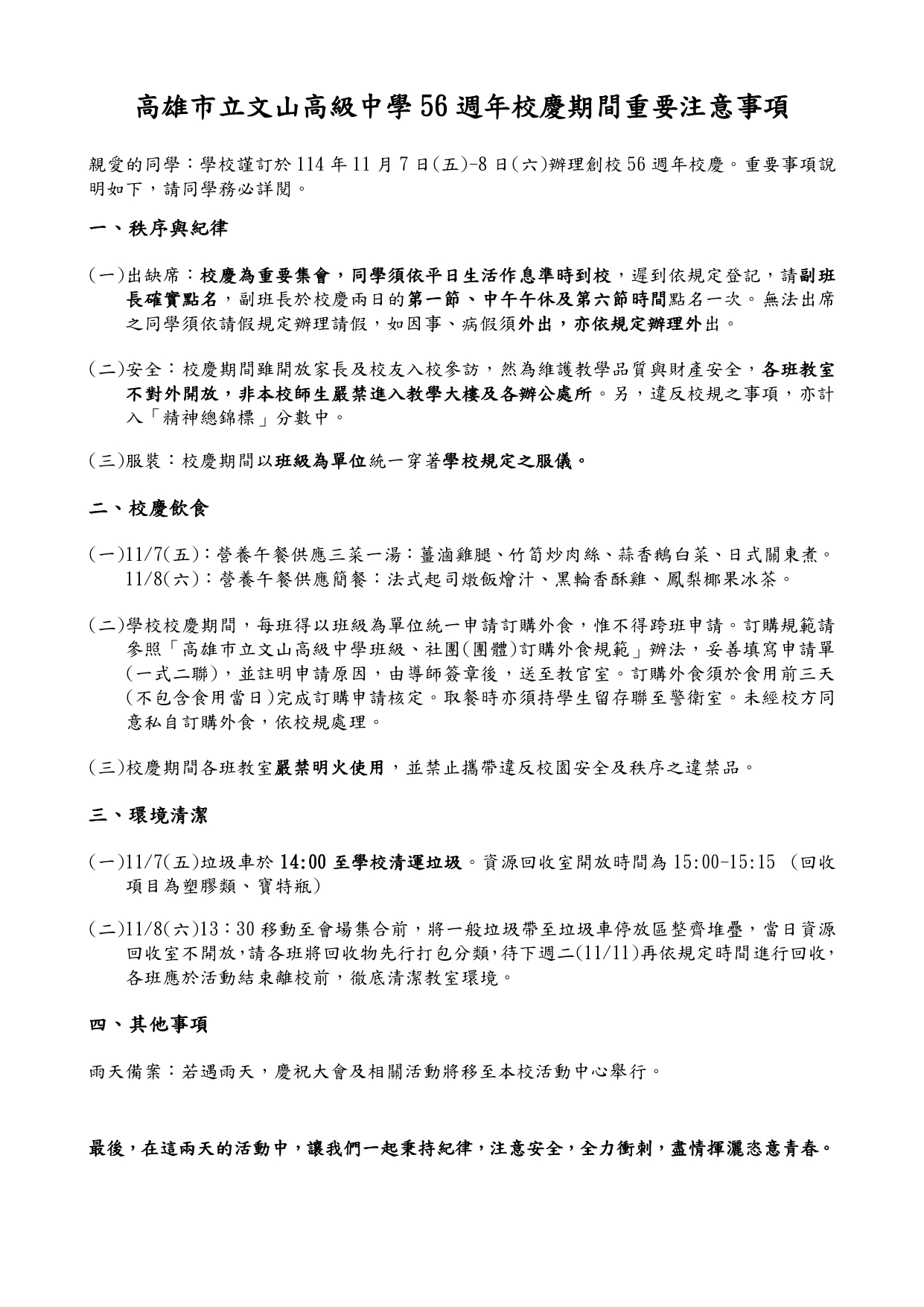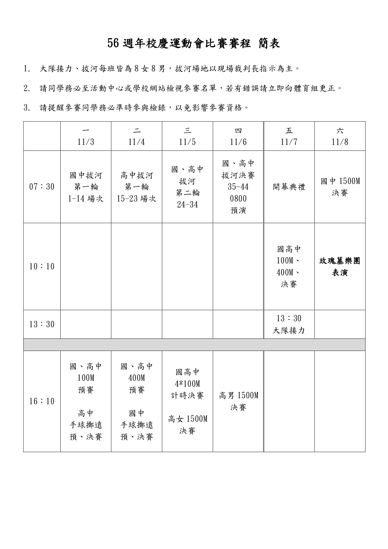 【校慶流程表】【注意事項】文山高中56週年校慶暨運動大會流程表及注意事項