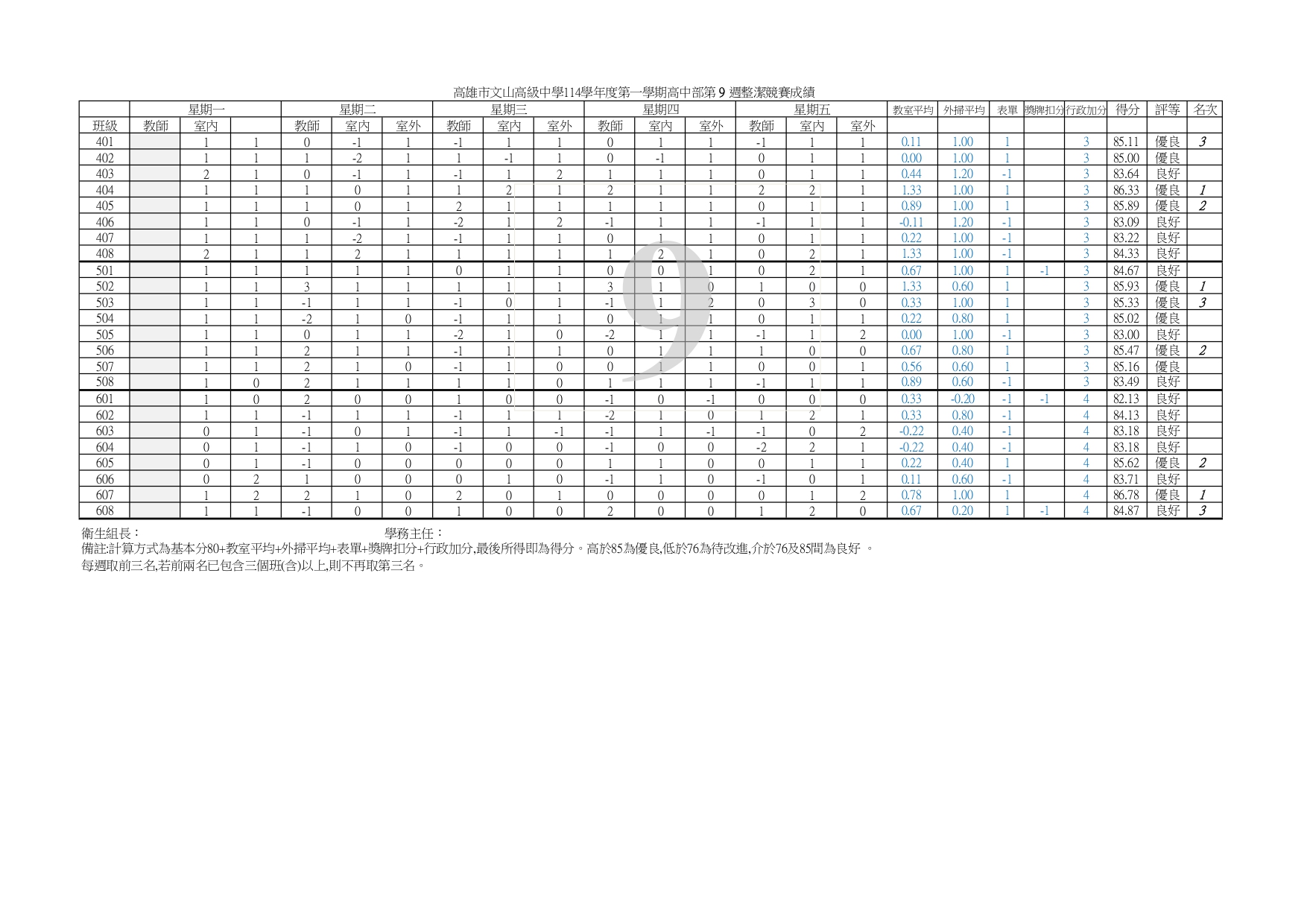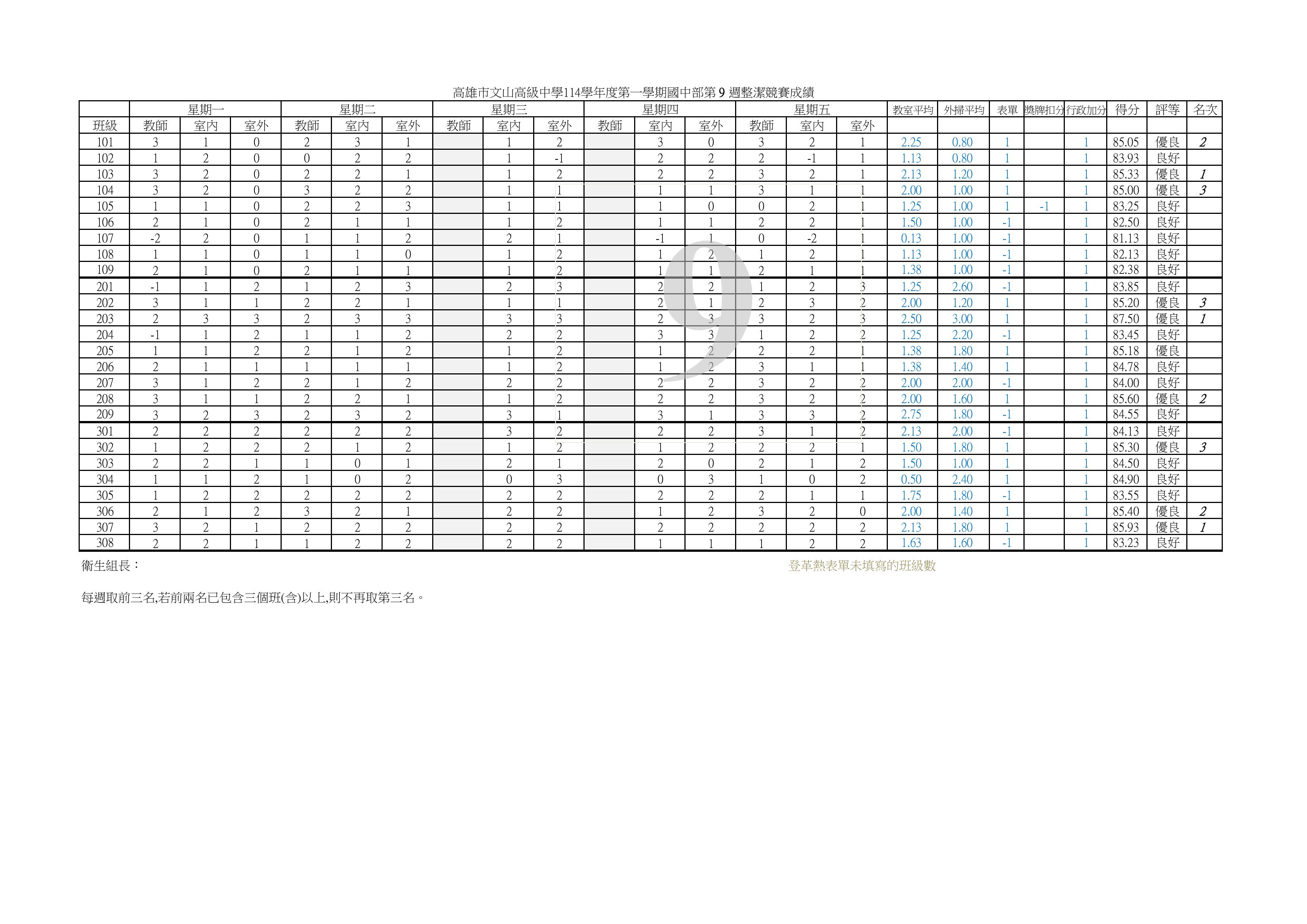 114-1【整潔】評分第 9 週成績報表