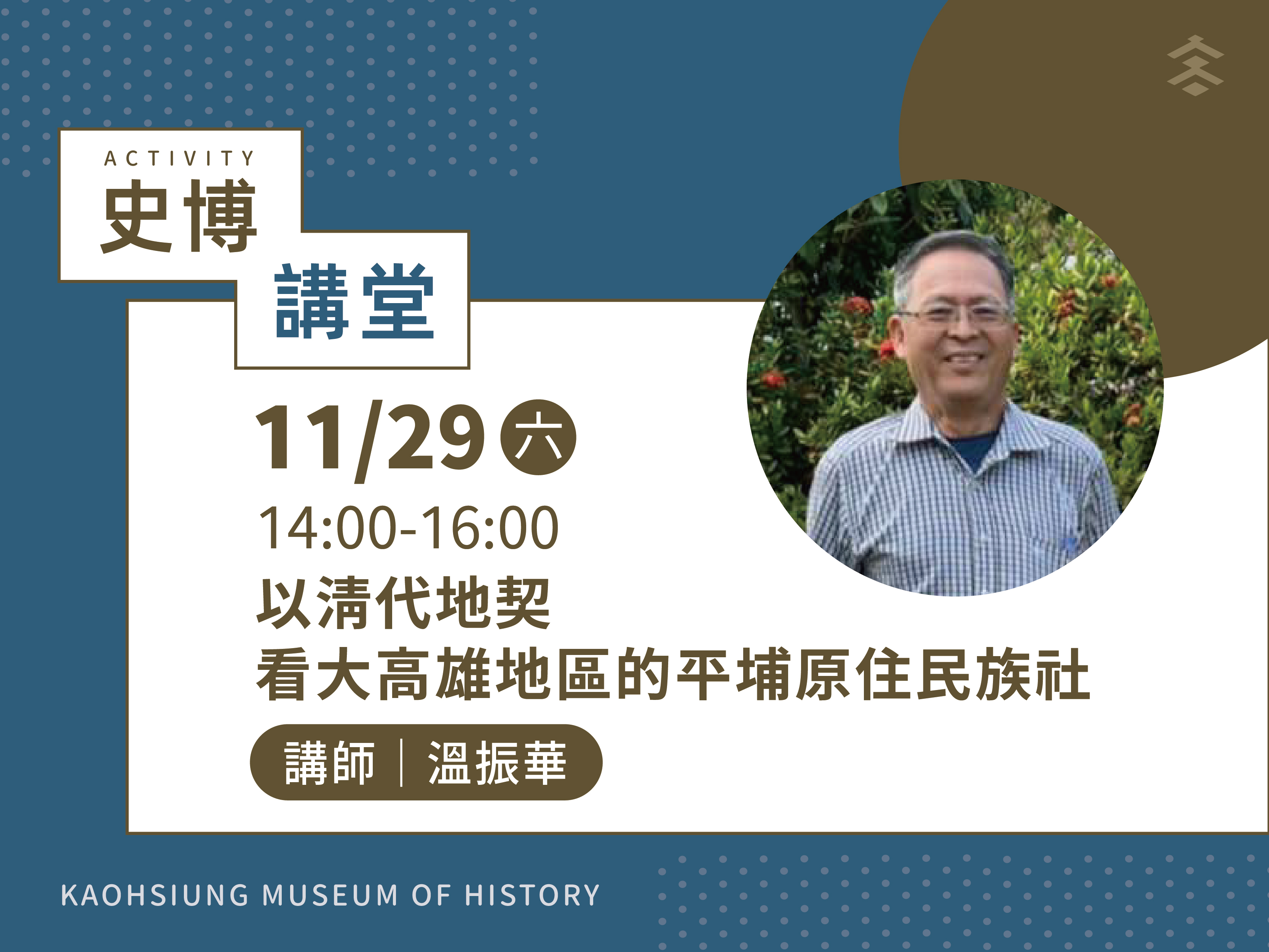 2025年11月份「史博講堂」講座-以清代地契看大高雄地區的平埔原住民族社二、講座資訊: (一)日期:114年11月29日(星期六) (二)時間:下午2時至4時 (三)地點:高雄市立歷史博物館203多功能室(高雄市鹽埕區中正四路272號) (四)講座名稱:以清代地契看大高雄地區的平埔原住民族社 (五)講者:溫振華(長榮大學台灣研究所退休教授) (六)講座介紹及報名資訊:https://khm.org.tw/tw/event/detail/336 三、敬請事先報名,活動詳情及注意事項請參閱本館網站活動公告,參加方式如有變更,將於本館網站公告。 四、本講座提供多種參與證明,詳情請至本館活動報名頁面確認。