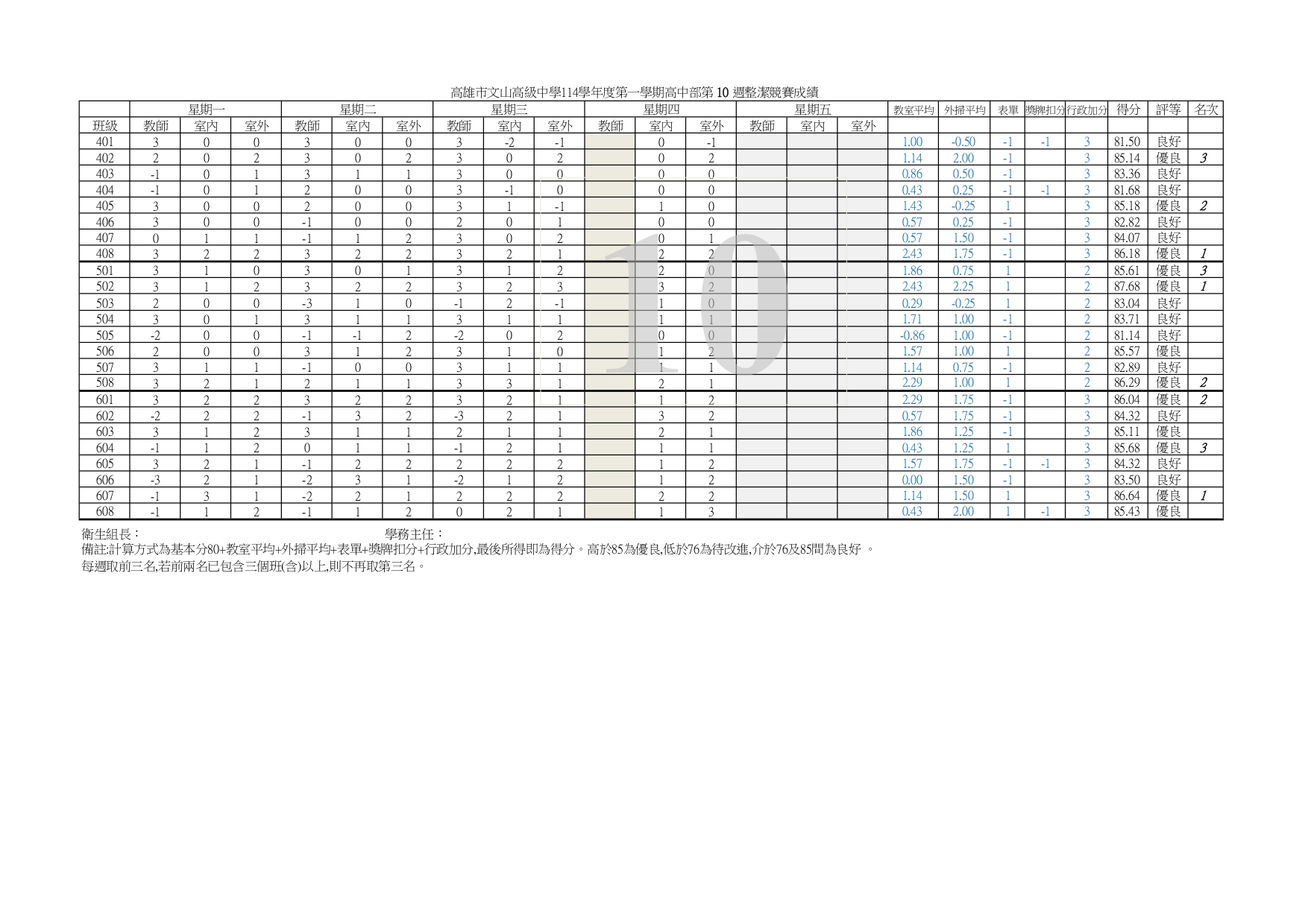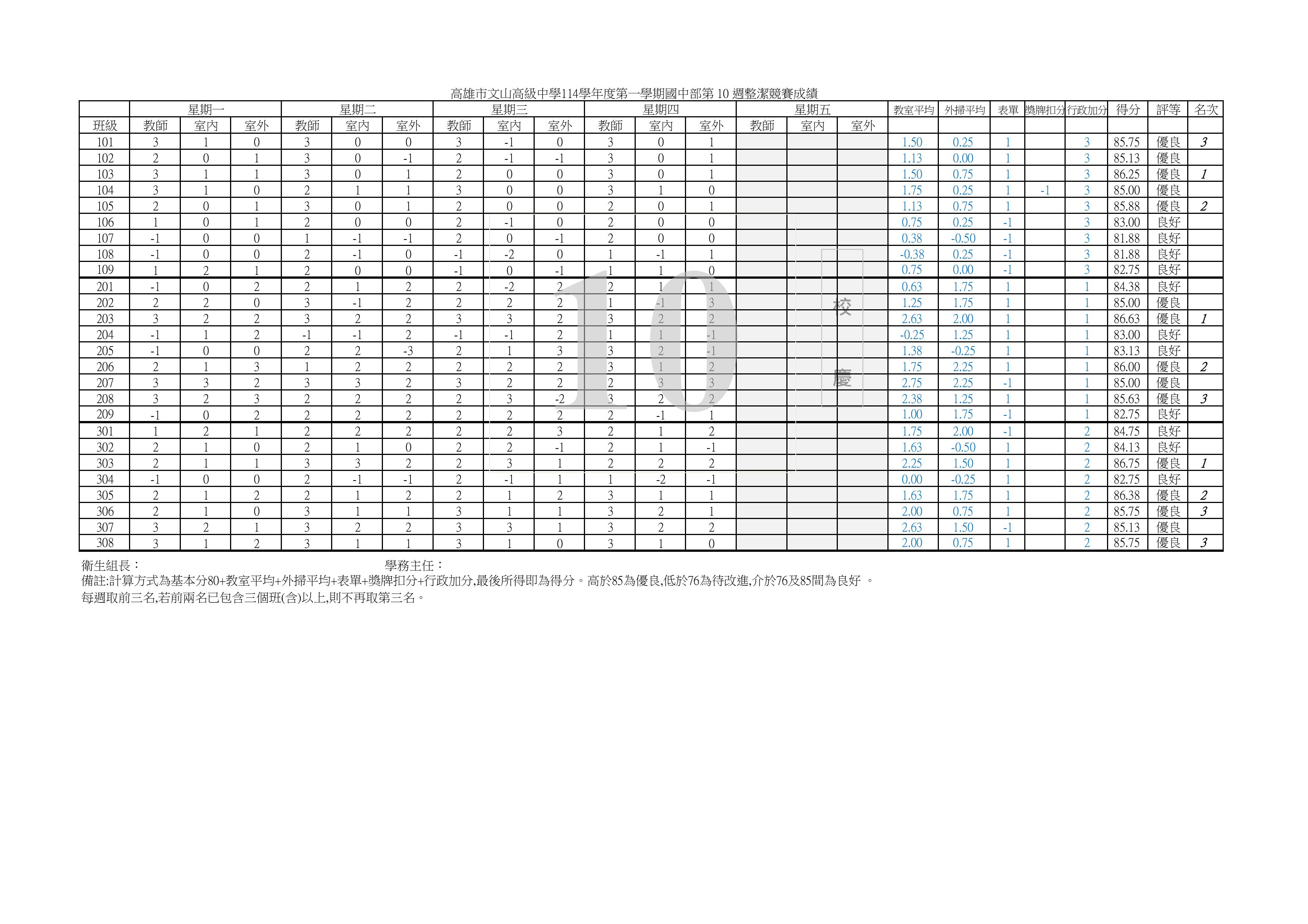 114-1【整潔】評分第10週成績報表