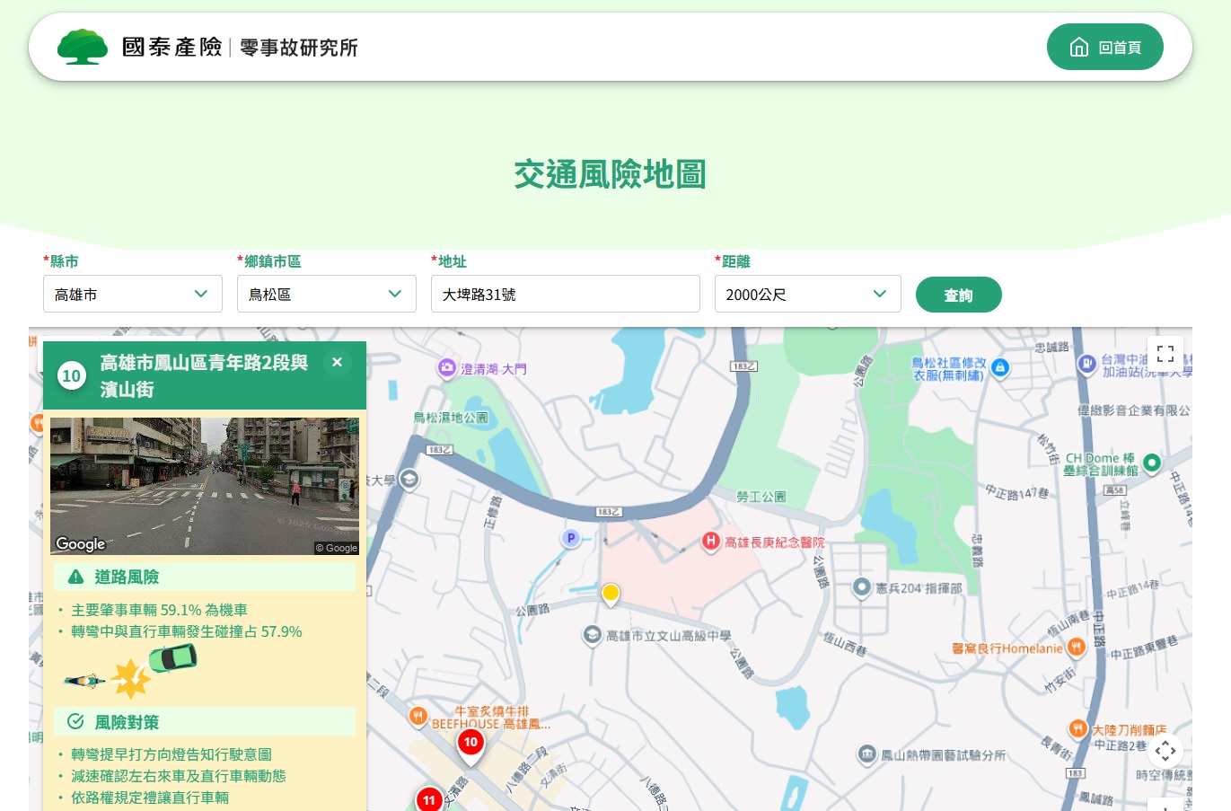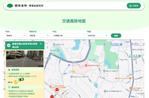 【交通資源】國泰世紀產物保險股份有限公司建置「校園交通風險地圖專區」已正式上線,歡迎參考運用,以利掌握交通事故熱點資訊一、依據教育部國民及學前教育署114年10月22日臺教國署學字第1140105876號函辦理。二、旨揭專區透過產官學合作,結合損害防阻專業、交通事故數據資料庫及學術研究成果,協助學校即時掌握校園周邊事故熱點及風險預防對策。三、「校園交通風險地圖專區」已上線至國泰產險零事故研究所網站(專區網址:https://zero-accidents.cathay-ins.com.tw/riskmap/risk-map.html),供各級學校師生使用,隨文檢附專區簡介及操作說明各1份,操作上如有疑義,請逕洽聯絡人林鈺慧小姐(電話:02-2755-1299分機5386)。
