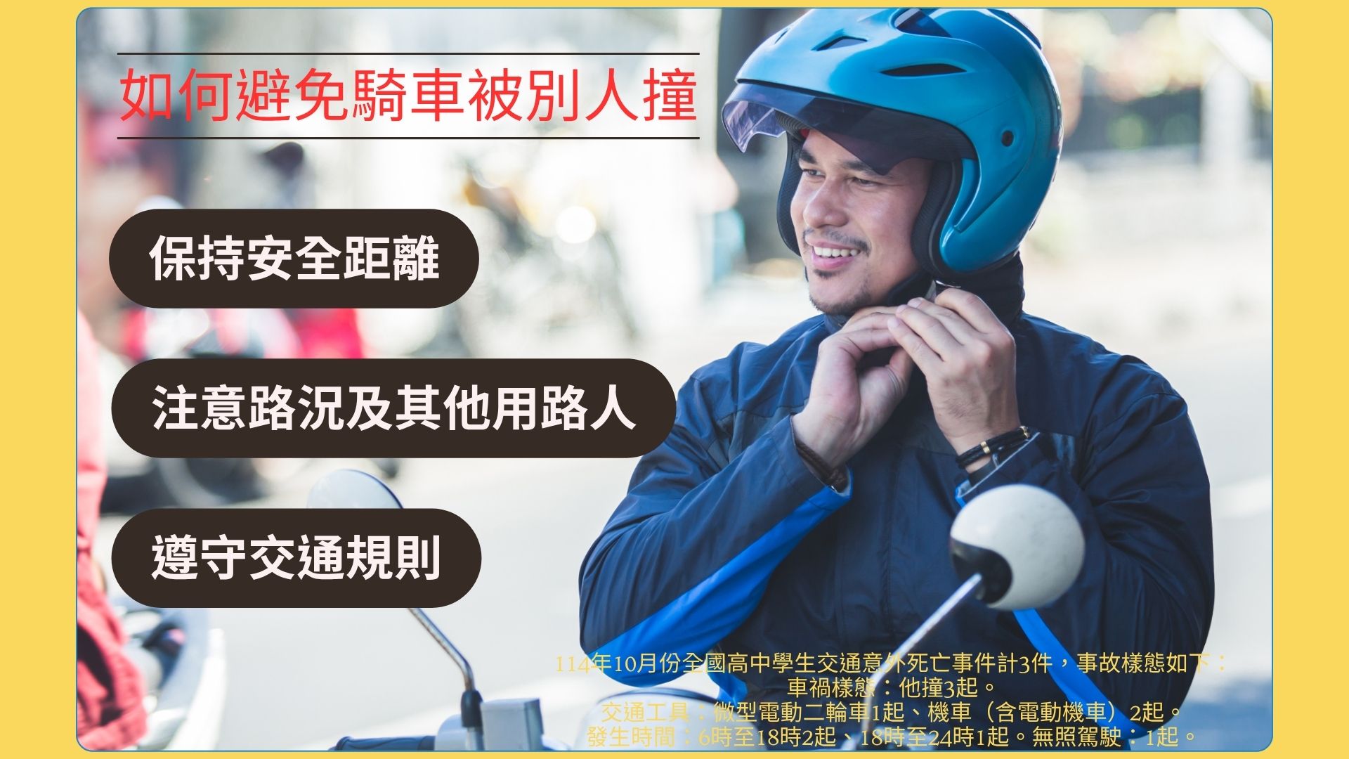 【轉知】國教署有關114年10月份全國高級 中等學校學生交通意外死亡事件樣態~請師生留意...一、依據教育部國民及學前教育署114年11月11日臺教國署學字第1145806714A號函辦理。二、經校園安全暨災害防救通報處理中心統計,114年10月份全國高級中等學校學生交通意外死亡事件計3件,事故樣態如下:(一)車禍樣態:他撞3起。(二)交通工具:微型電動二輪車1起、機車(含電動機車)2 起。(三)發生時間:6時至18時2起、18時至24時1起。(四)無照駕駛:1起。三、請學校配合相關集會、課程、友善校園週或多元管道,運用交通部各教育階段交通安全教材手冊、國教署交通安全補充教材手冊(機車騎乘安全篇)、道路交通法規(如行 人專用號誌及行車管制號誌等各燈號顯示意義)、交通意外案例及交通部道安總動員網頁(事故傷亡數據、肇因分析、校園周邊肇事熱點)等資源,向學生加強教育宣導。四、鑒於自行車、微型電動二輪車及電動輔助自行車日漸普 及,請學校妥善規劃相關車輛停放位置,並強化學生相關騎乘安全教育,防範交通意外事件。另鼓勵教師參考「交 通部168交通安全入口網(自行車專區)」、「教育部教育雲」、「教育部磨課師」、「交通部交通安全教材手冊 (安全騎乘自行車教學指引手冊)」及「交通安全教學輔助軟體」等教學資源,結合部定課程或校訂課程使用,以提升學生相關素養及知能。五、請學校結合家長日、親師座談或各項會議時機,與家長溝 通建立共識,另針對無照駕駛之學生造冊掌握,並請務必聯繫家長,透過學校輔導機制、獎懲規定,及請家長蒞校參加學生獎懲會議、座談會等方式,強化家庭教育支持系統,與法定代理人連帶賠償責任等相關法治觀念,共同教育學生,避免無照駕駛或衍生偏差行為。
