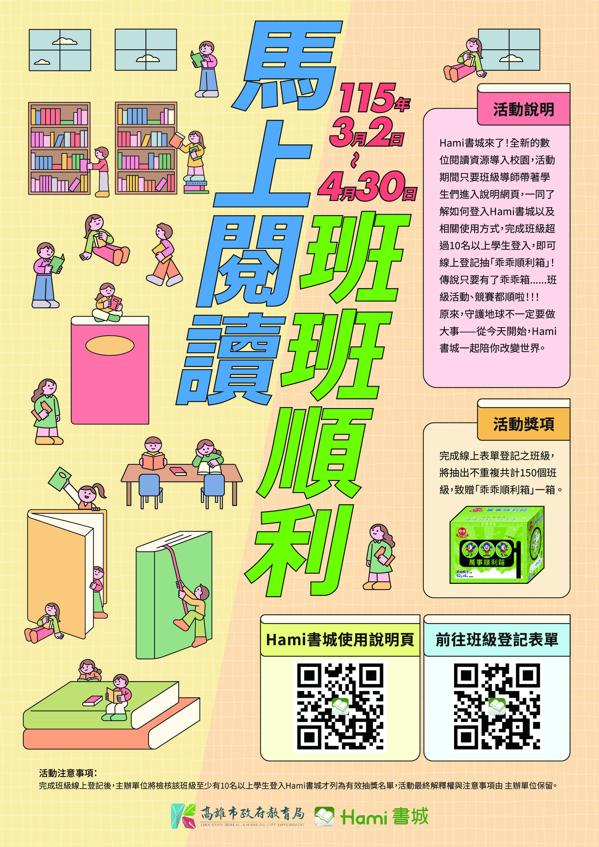 二、為協助校園深化數位閱讀應用,提升學生閱讀素養並推動低碳學習行動,Hami書城規劃於115年3月至6月辦理「Hami書城數位閱讀推廣活動及線上說明會」,透過班級宣導、閱讀競賽及教師線上說明會等方式,引導師生善用Hami書城數位閱讀資源,營造校園閱讀風氣。本次活動特別結合「省碳閱讀」概念,鼓勵學生以實際閱讀行動響應環境永續,使閱讀同時成為愛地球之具體實踐。